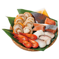 ボイルほたて(北海道沖)120g(4玉)×2袋、真だら切身(北海道沖)100g(4切)×1袋、秋鮭切身(北海道沖)50g(2切)×2袋、ボイルしまえび(北海道沖)50g(4尾)×1袋、添付たれ90g×1袋
