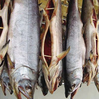 村上の鮭の歴史は古く、平安時代には遠く京都の王朝貴族に献上されていたことが記録に残っています。江戸時代に入ると、鮭は村上藩の貴重な財源となりました。なかでも逸品といえるのが「塩引鮭」。原料は鮭と塩のみ、添加物を使わずに自然の力と手間ひまで、うまみを引き出します。本品では北海道産の鮭を使用。
