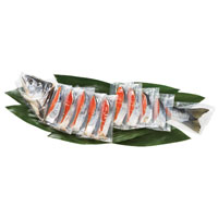 ロシア産の紅鮭を塩水につけ込み、ふた晩低温熟成して、うまみを引き出しました。頭から尾まで姿切りにした切り身を、食べやすいように個包装にしています。