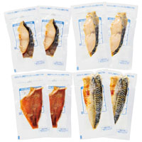 赤魚味噌漬焼(アメリカ産)60g×2切、さば味噌漬焼(ノルウェー産)60g×2切、銀鱈味噌漬焼(アメリカ産)50g×2切、さわら味噌漬焼(韓国産)50g×2切:計4種8袋