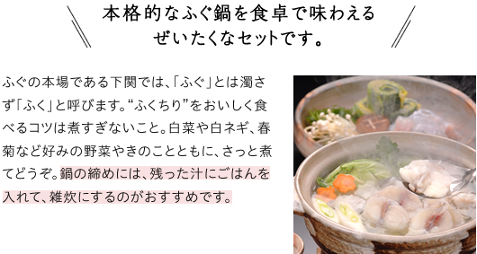 ゴマフグのアラからとったふぐのだしに、しょうゆや酒などと、昆布やかつお、しいたけの風味を加えて仕上げた深い味わいです。