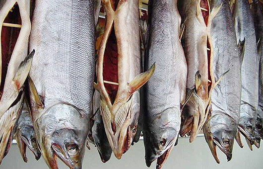 村上の鮭の歴史は古く、平安時代には遠く京都の王朝貴族に献上されていたことが記録に残っています。江戸時代に入ると、鮭は村上藩の貴重な財源となりました。なかでも逸品といえるのが「塩引鮭」。原料は鮭と塩のみ、添加物を使わずに自然の力と手間ひまで、うまみを引き出します。本品では北海道産の鮭を使用。