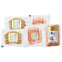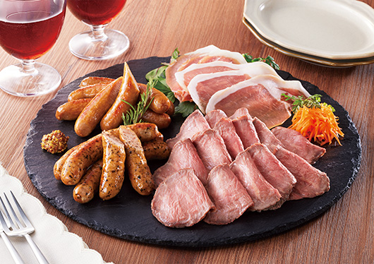 ローストビーフ、無塩せきウインナー2種、生ハムの詰め合わせ。それぞれ、北海道産の豚肉、牛肉を使用しています。ローストビーフは塩のみを使い、牛肉のうまみをていねいに引き出しました。