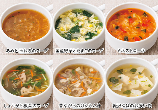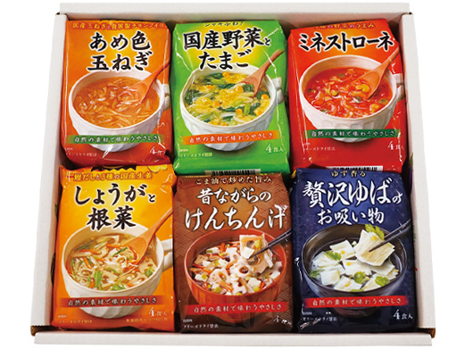 忙しい方や、ひとり暮らしの方にも喜ばれる、お湯を注ぐだけの6種類のスープセット。6種類の味が各4食も入って、ボリュームたっぷり。