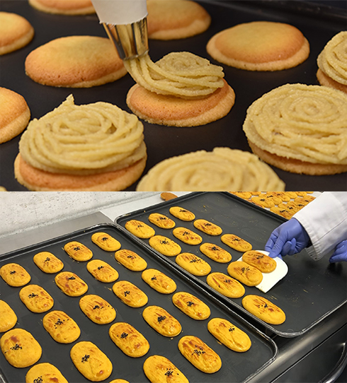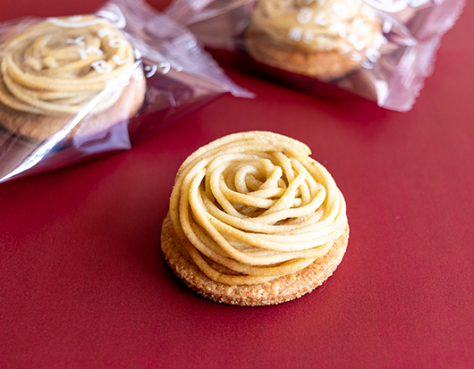 『焼きモンブラン』は、バターのサブレの土台にモンブランクリームをひとつずつ手しぼりで仕上げました。その表情はさまざまですが、これも手しぼりならではの味わいだと思います。『いも焼き菓子ひがしやま』の開発コンセプトは、芋そのままの甘さを生かすこと。バターと砂糖、白あんを少し足したのみの芋の甘さ、香りを感じるスイートポテト風の商品となっています。