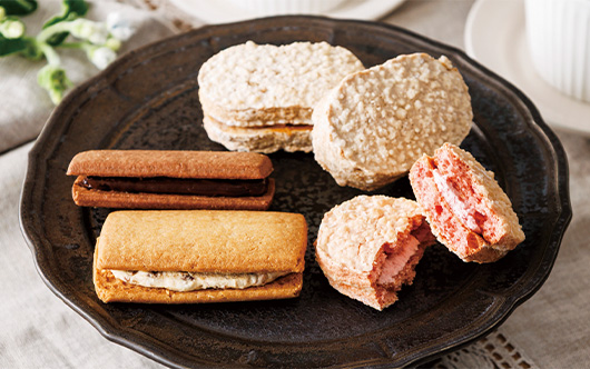 栃木県産大麦を使用して焼き上げた生地にクリームをサンドした洋菓子。サクッ、フワッとした生地が特長で、生地の香ばしさにプラスして中のクリームもバラエティー豊富。国産大麦100%で焼き上げた大麦ダクワーズをはじめ、5種類の味が楽しめます。