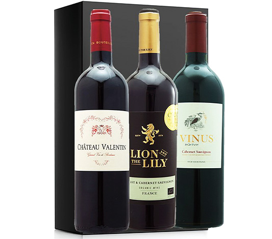 ライオン&ザ・リリーボルドー(アルコール度数13度)、シャトー・ヴァランタン(アルコール度数14.5度)、ヴィニウス・リザーヴ・カベルネ(アルコール度数14度)各750ml