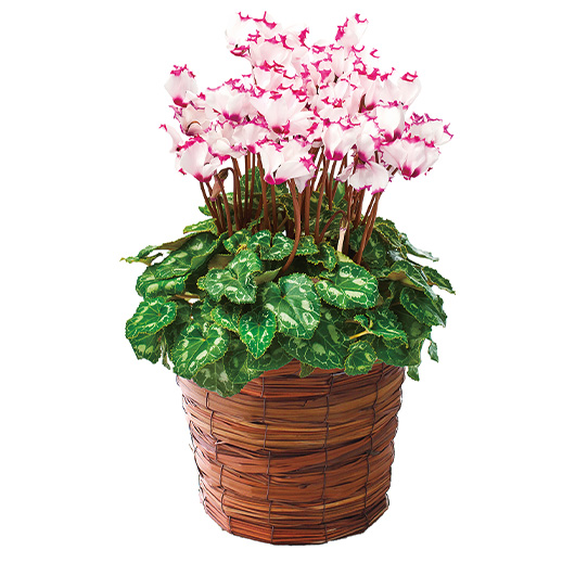 ビクトリア咲きの香り品種です。白い花の中心とふちに赤がのるかわいらしいシクラメンです。