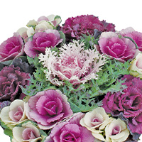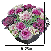 多様な色と形をしたハボタンが一鉢に詰まった豪華な寄せ植えです。