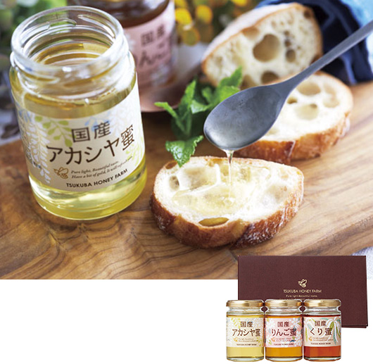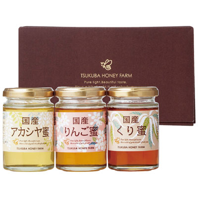色や香り、そして味の異なる3種類の国産はちみつを食べ比べできる詰め合わせ。『国産アカシヤ蜜』はくせが少なくポピュラーな味わい、『国産りんご蜜』はやさしい甘みでまろやかな口あたり、『国産くり蜜』は深いコクと味わいがもち味です。そのままでも、料理の隠し味に使うのもよし。ご家庭にあれば毎日の食卓が楽しくなる、ギフトに喜ばれるアソートです。